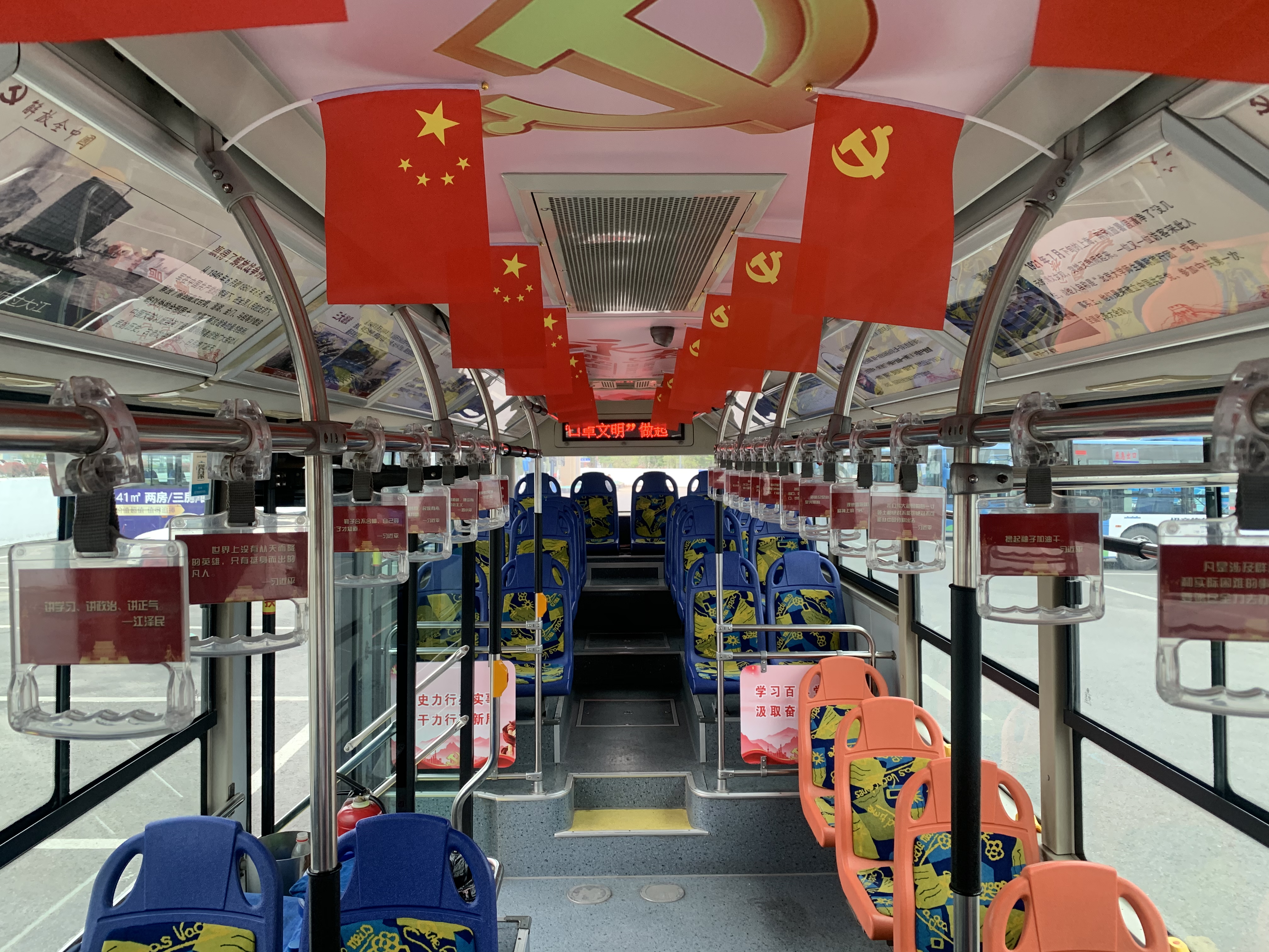 車廂里,踏上主題車,映入眼簾的是那一抹艷麗的中國紅,將“紅色文化”氛圍感拉滿。車廂內(nèi)頂紅色國旗掛滿兩側(cè),車內(nèi)看板上通過圖文并茂的形式生動形象再現(xiàn)黨的光輝歷程,拉手上投放黨的歷屆偉人金句振奮人心,整個車廂熱情而莊重,形成了一道靚麗的風(fēng)景線。