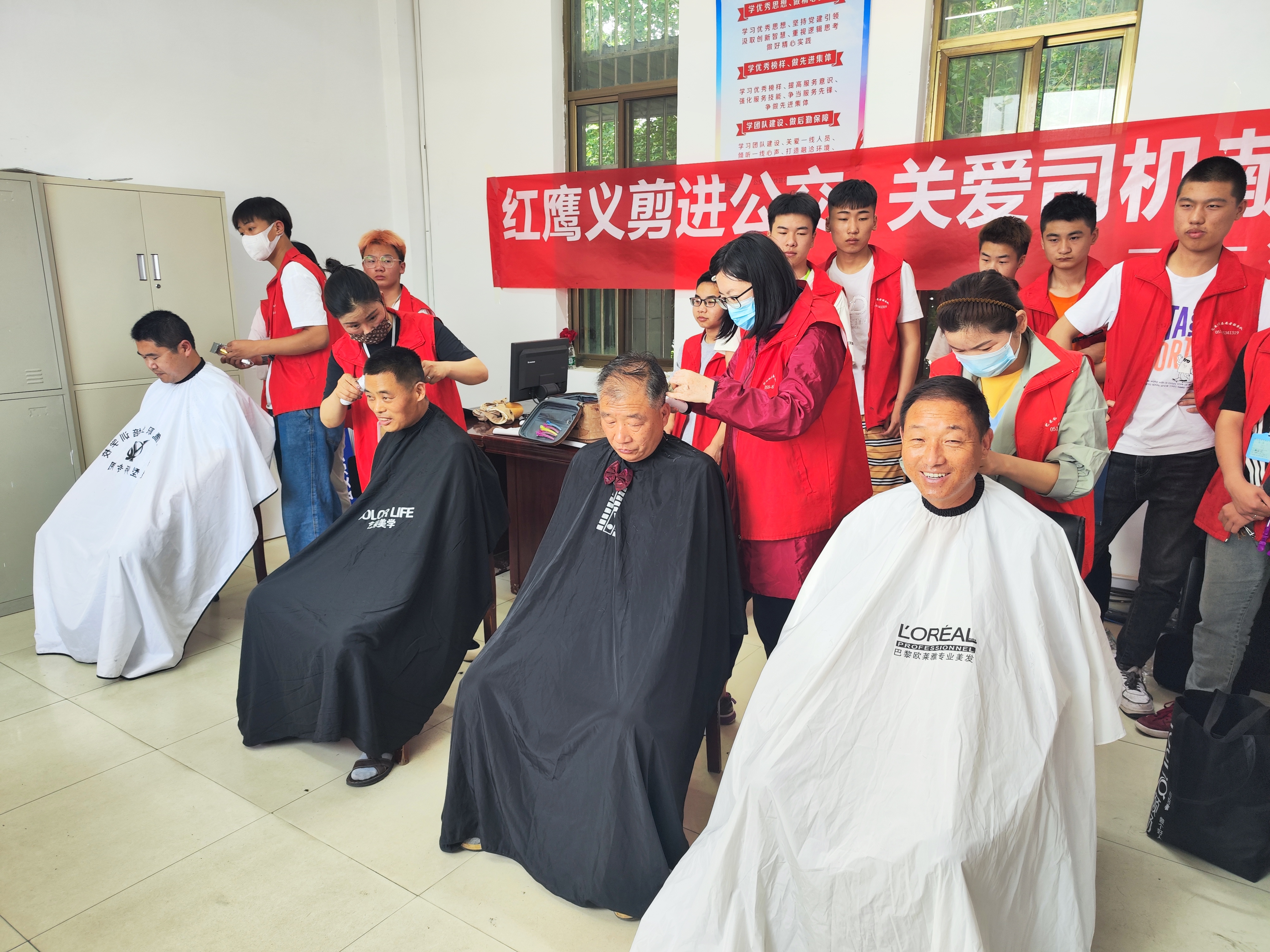 在海州客運總站和西城公交站的駕駛員休息室里,剪刀、推子、梳子、圍布、座椅等工具一應俱全,理發師們一邊給駕駛員們洗好頭發,一邊耐心的詢問駕駛員想要的發型。伴隨著清脆的剪刀聲和上下翻飛的梳子,不一會兒,一位位精神抖擻的駕駛員就出現在了大家的眼前,見此情景,來理發的駕駛員們越來越多,隊伍越來越長。在等待過程中,藝采紅鷹美發學校還安排專業的技師給駕駛員們做推拿和針灸服務,享受過理發服務的駕駛員們紛紛表示,由于工作性質原因,經常會因為忙碌錯過理發店的營業時間,今天的義剪雖然只是解決了生活的小問題,但是卻讓自己感受到了公交集團這個大家庭的溫馨和關愛,今后將以嶄新的精神面貌投入到工作中去,為廣大市民提供更加優質的乘車服務。