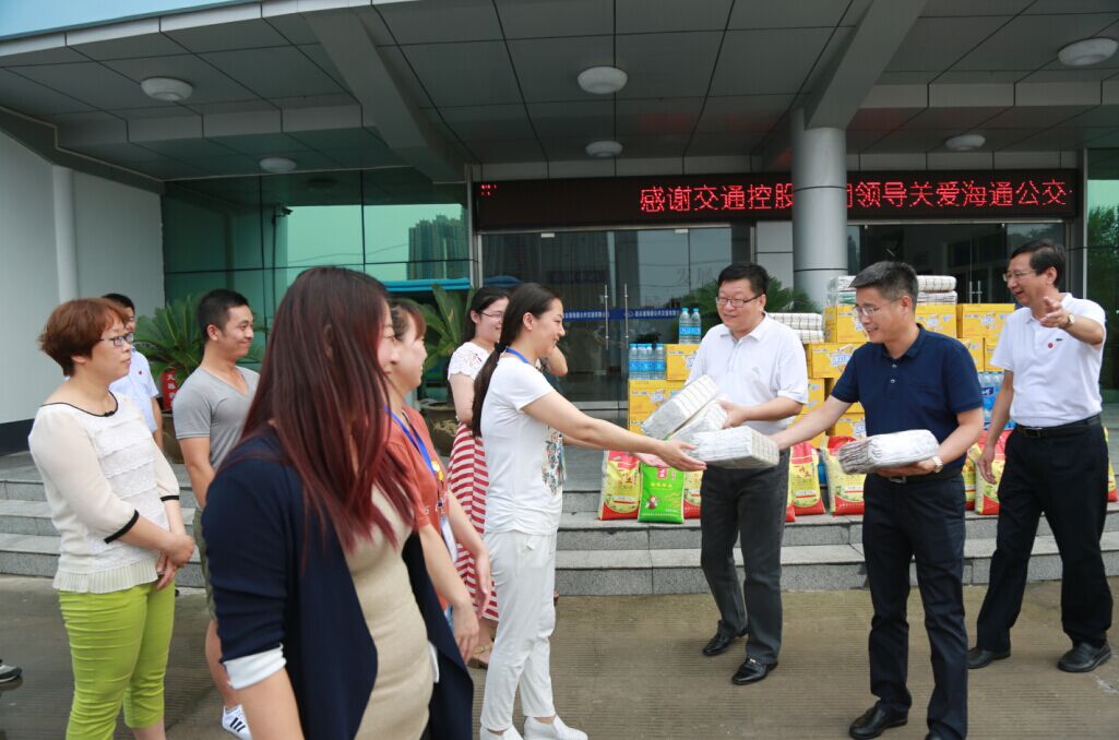 7月26日下午,交通控股集團黨委書記、董事長劉永能,黨委副書記、總經理仲偉濤,工會主席王中永等集團領導冒著高溫來到海通公交公司,親切看望慰問了高溫下堅守崗位的公交一線員工,為他們送去綠豆、白糖、純凈水、飲料等防暑降溫物品,并叮囑他們注意防暑降溫,以良好的狀態投入到工作中去,做好安全服務工作,服務好廣大乘客。劉永能等領導叮囑隨行的公交公司領導,一定要關心員工的身心健康,尤其要做好夏季的防暑降溫工作,把“送清涼、送安全、送法律”活動落到實處,讓廣大員工真正感受到組織的關愛。