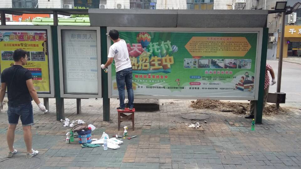 此次活動的開展,再一次清理了站牌上的小廣告,清洗了站亭的立柱、玻璃等。大家不怕臟和累,不畏天氣炎熱,對一些貼在高處的小廣告,踩著凳子,用綁著竹竿的鐵鏟,一點一點地清除干凈。