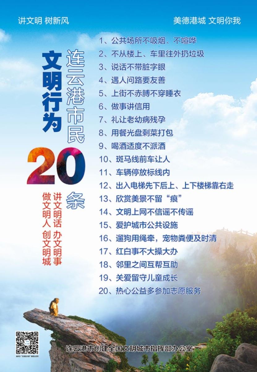 你們好!創建全國文明城市,提高城市文明程度,建設文明幸福、風景優美、高質發展的連云港是港城人民的共同心愿。讓我們積極行動起來,從自己做起,從具體事情做起,為港城更美好的明天出一份力。