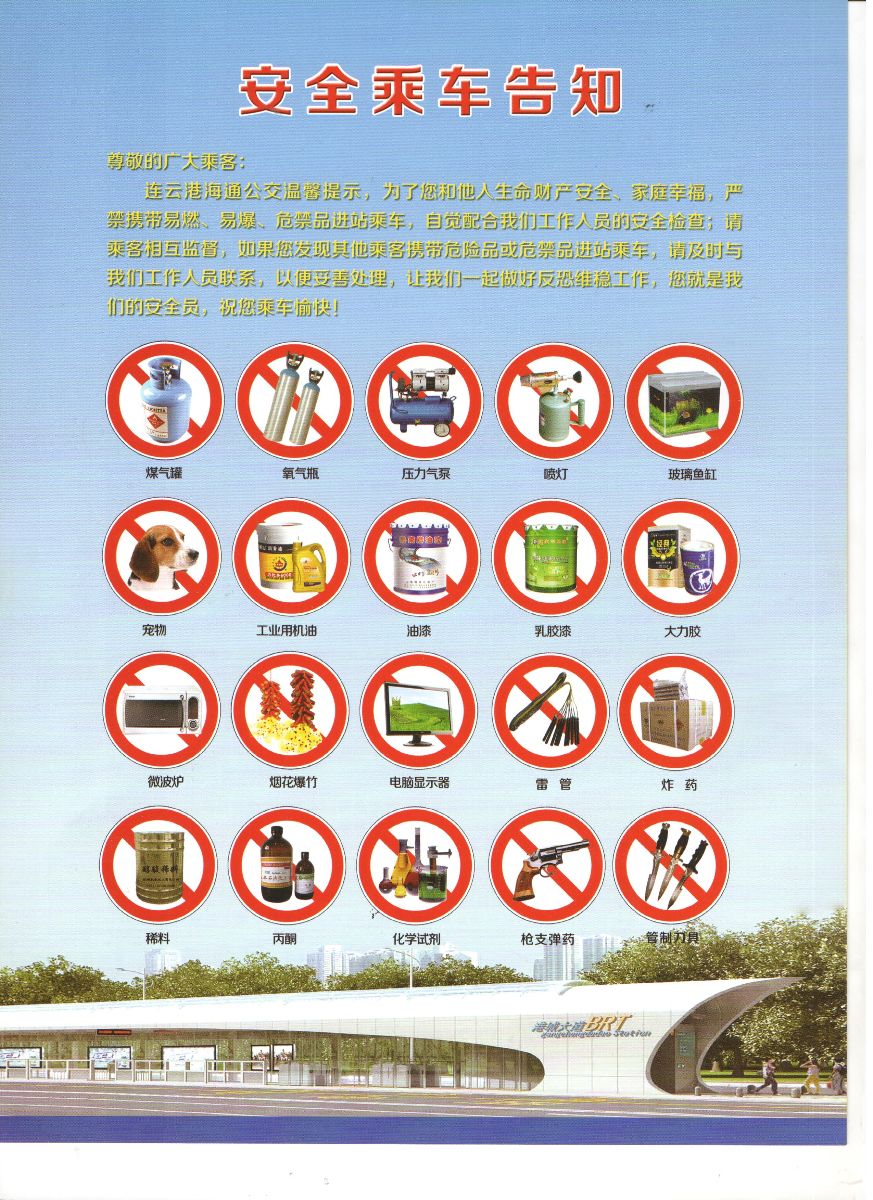 為確保活動取得成效,公司結合當前反恐維穩嚴峻形勢,制作圖文并茂的安全生產宣傳資料——《海通公交安全乘車溫馨提示》,于咨詢日當天在九龍大世界廣場、BRT市民廣場站、新浦火車站廣場以及海州客運站面向廣大市民發放1500余份,提醒廣大乘客不要攜帶易燃易爆等危險品乘坐公交車,呼吁廣大乘客強化安全意識,人人爭做“安全員”,自覺維護乘車安全。