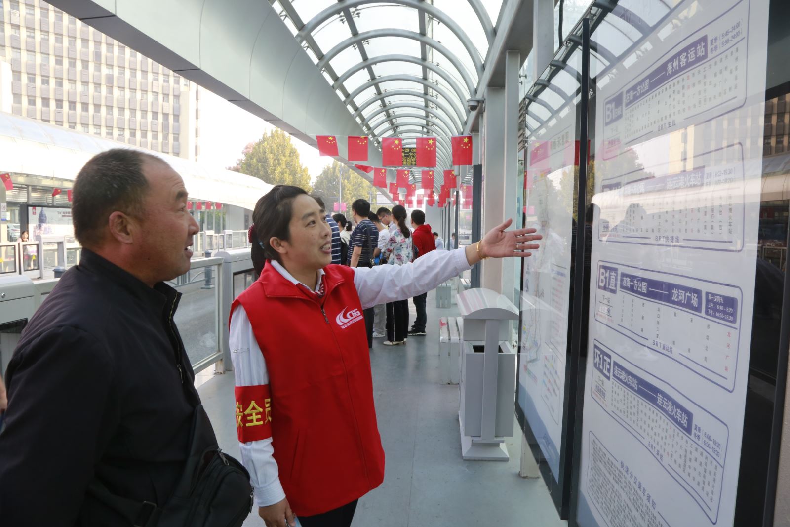 國慶期間,公交集團給海州站、龍河廣場、購物中心等十三個BRT站臺配備雙班站務員,同時配備手持金屬檢測儀,對乘客是否攜帶違禁品進行準確掃描。另外,我們還為每個換乘站配備了一名穿工作服佩戴紅袖章的安全員,協助站務員對乘客攜帶可疑包裹、物品進行檢查,對可疑人員進行詢問,杜絕危險品進站上車,進一步提高BRT站臺的安全等級。