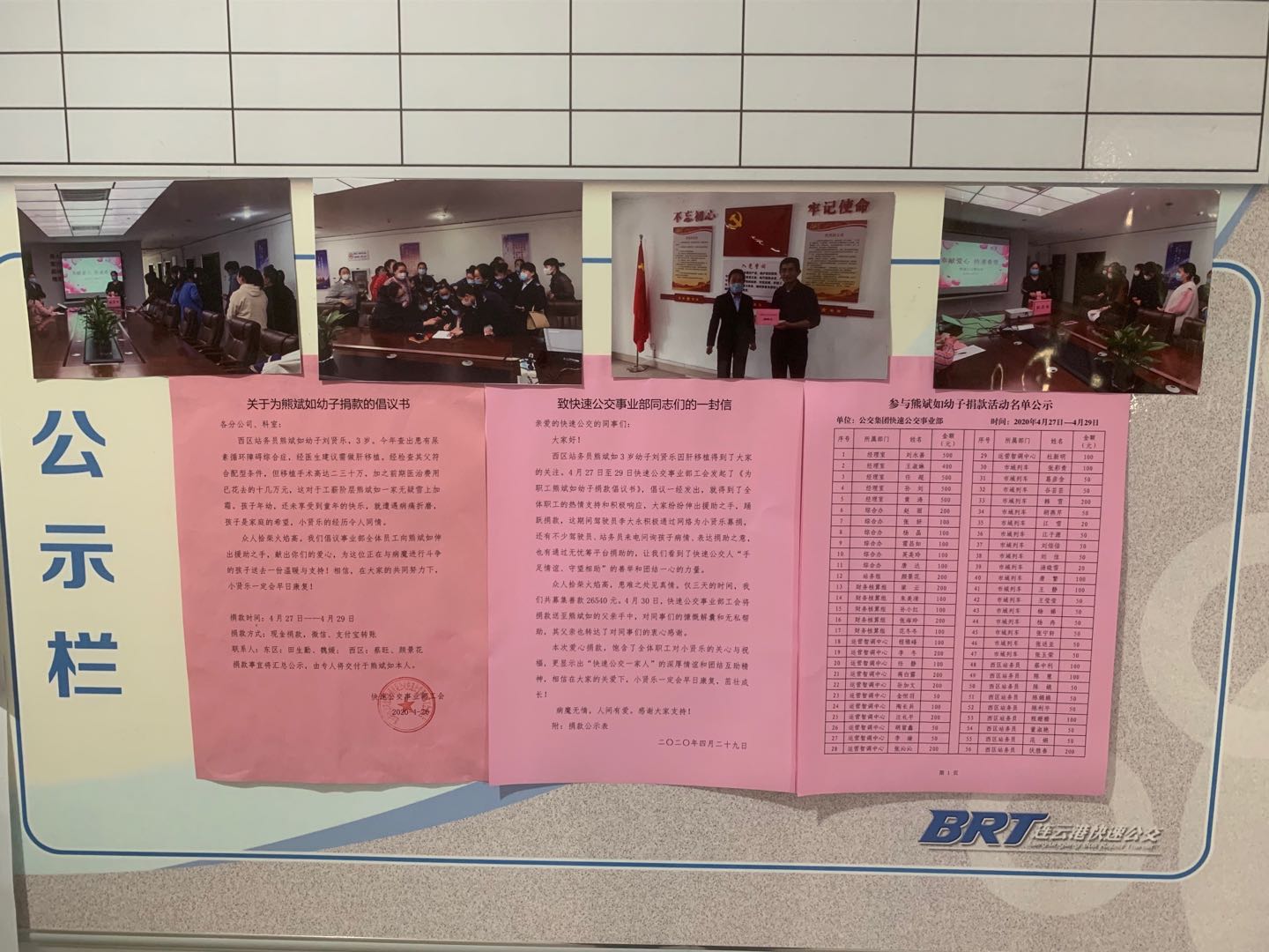 西區站務員熊斌如3歲幼子劉賢樂,今年查出患有尿素循環障礙綜合癥,醫生建議需做肝移植,其父符合配型條件,但移植手術高達二三十萬,加之前期醫治費用已花去的十幾萬元,這對于工薪階層熊斌如一家無疑雪上加霜。在獲悉情況后,快速公交事業部領導第一時間組織相關部門籌備愛心捐助事宜,并及時與熊斌如聯系,了解小賢樂的身體狀況。隨后快速公交事業部工會精心組織,迅速在微信群、各場站宣傳欄發出《捐款倡議書》,號召全體干部職工獻出愛心,幫助同事共渡難關。情同手足,守望相助。倡議一經發出,就得到了全體職工的熱情支持和積極響應,大家紛紛伸出援助之手,踴躍捐款,50元、100元、200元、500元......不到兩天的時間,共募集善款2.6萬余元。這期間有駕駛員發動自己的粉絲團為小賢樂捐款,有人通過無憂籌平臺捐助,不少駕站人員來電詢問孩子病情。